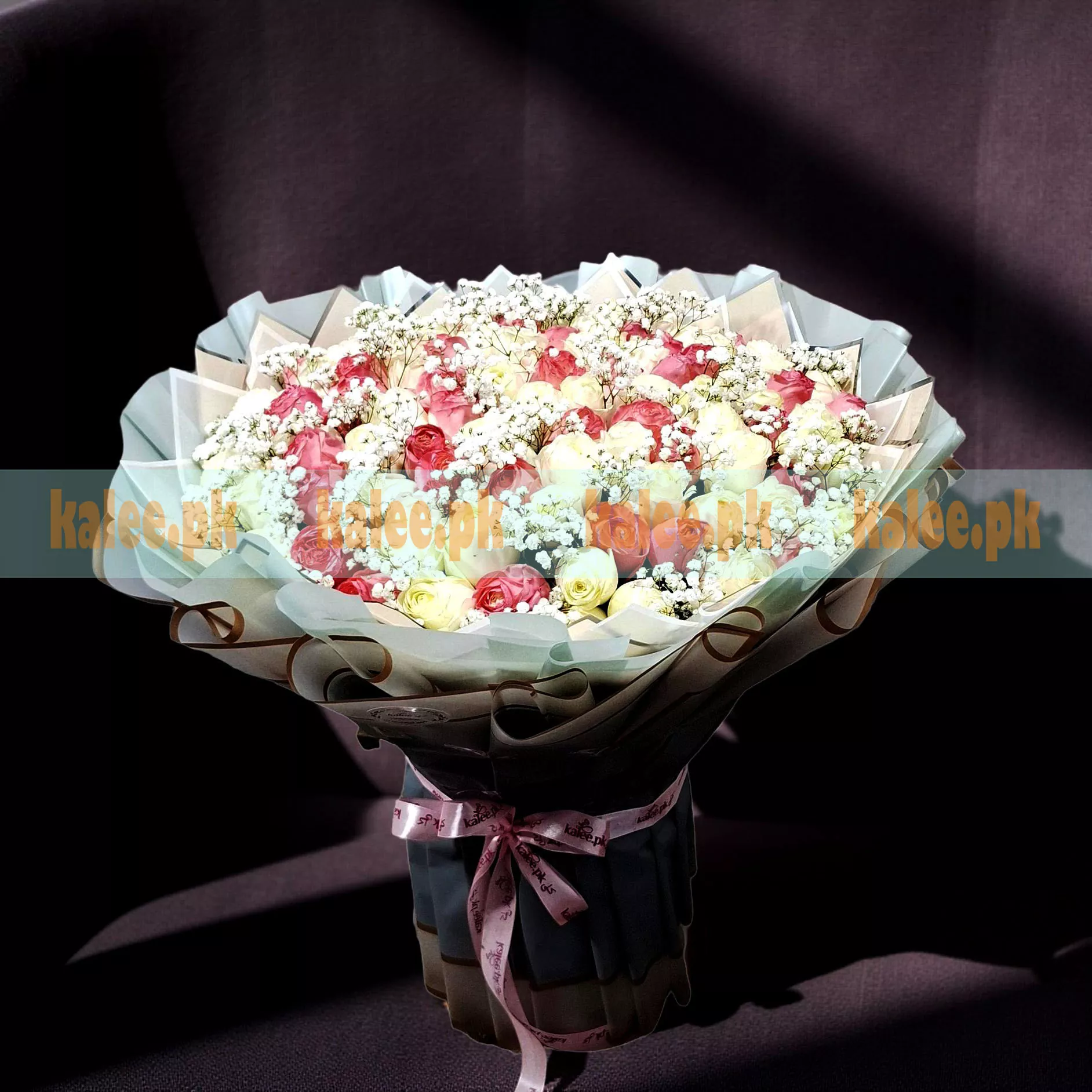 100 Pink And White Roses Bouquet With Baby’s Breath